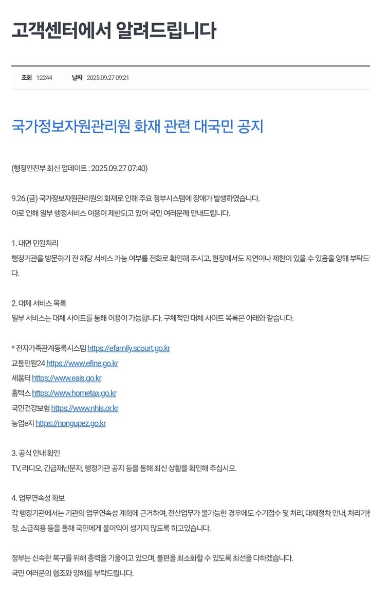 국가정보자원관리원(국정자원) 화재로 국가 전산망 기능이 사실상 마비되면서 정부가 민간 플랫폼인 네이버와 다음을 대국민 공지 대안 창구로 활용하고 있습니다.