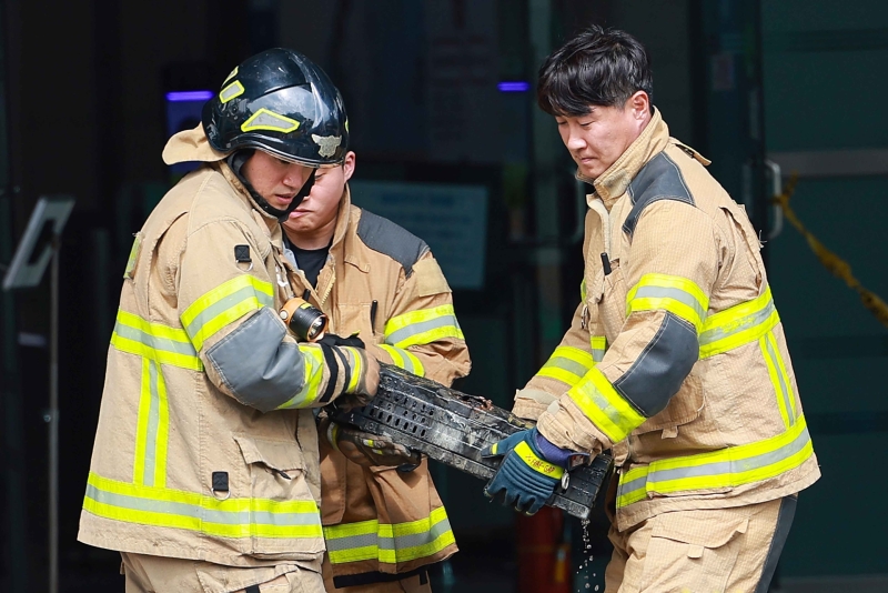 ▲ 국정자원서 불에 탄 배터리 옮기는 소방대원 [연합뉴스]