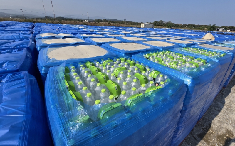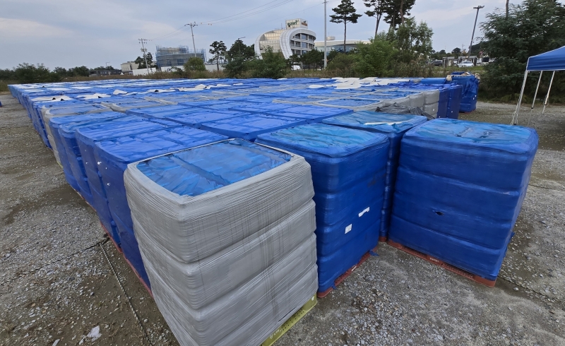 9월 하순 강릉아레나 주차장에 있던 남은 생수들은 야외 주차장으로 옮겨졌는데, 현재는 비바람을 맞고 햇볕에 그대로 노출된 채 흙먼지가 쌓이고 있는 상태입니다.