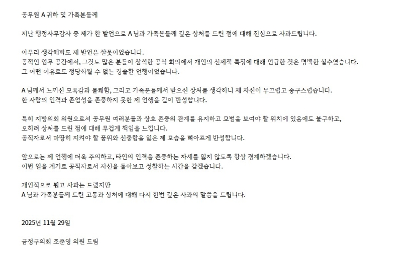 조 의원은 "지난 행정사무감사 중 제가 한 발언으로 A님과 가족께 깊은 상처를 드린 점에 대해 진심으로 사과드린다"면서 "공적인 업무 공간에서, 많은 분이 참석한 공식 회의에서 개인의 신체적 특징에 대해 언급한 것은 명백한 실수"라며 사과했습니다.