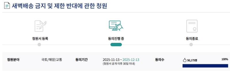 국회 국민동의 청원 게시판에 지난달 13일 올라온 '새벽배송 금지 및 제한 반대에 관한 청원' 동의자 수가 7일 밤 9시 기준 5만 6천여 명의 동의를 얻었습니다.