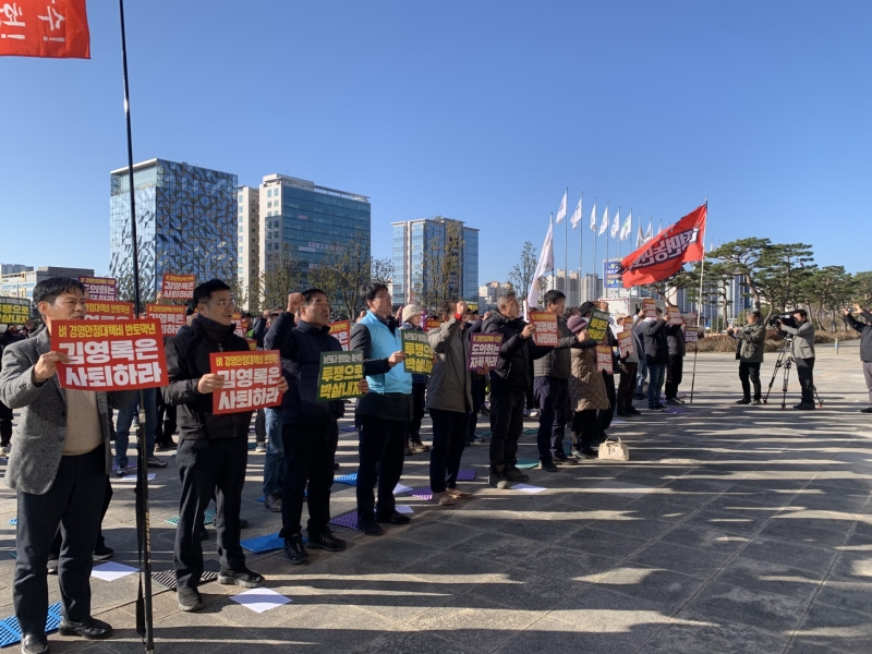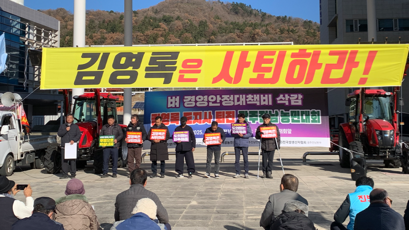 농민단체들은 전라남도의회 앞에서 '벼 경영안정비 삭감 김영록 도지사 퇴진 광주전남농민대회'를 열고 예산 삭감안 철회를 촉구했습니다.