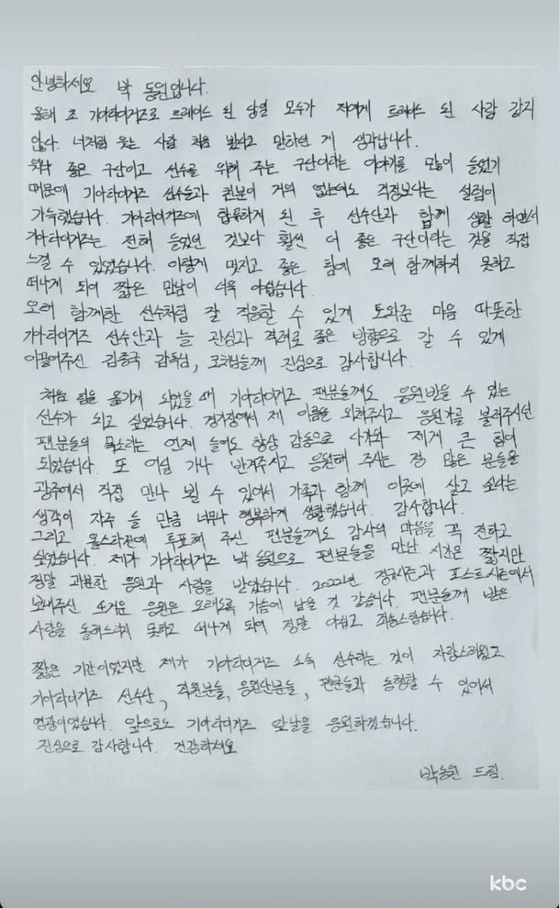 박동원은 오늘(26일) 부인의 SNS에 손편지를 올려 KIA 구단과 팬들에게 고마움과 미안함을 표했습니다.