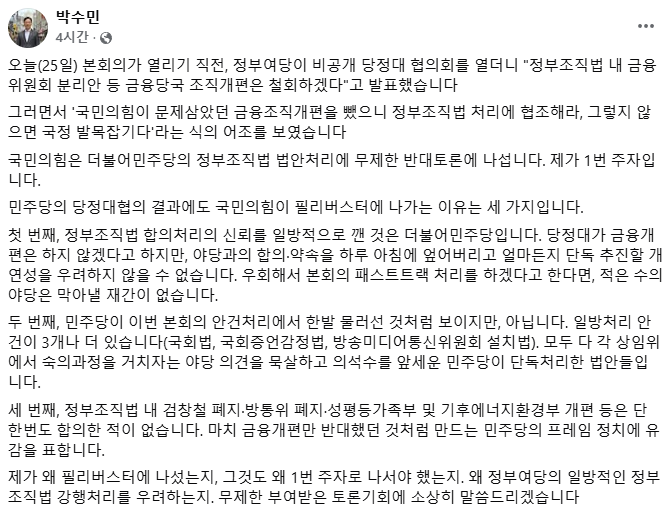 민주당 박수현 수석대변인은 국회 브리핑에서 "국민의힘의 정부조직법 필리버스터는 국민 배신이고 국정 파괴"라며 "국민의힘은 새 정부의 정부조직법 개정안을 필리버스터로 저지하려는 역대 최초의 사례를 기록하는 것을 알기는 하는 것이냐"라고 비판했습니다.
