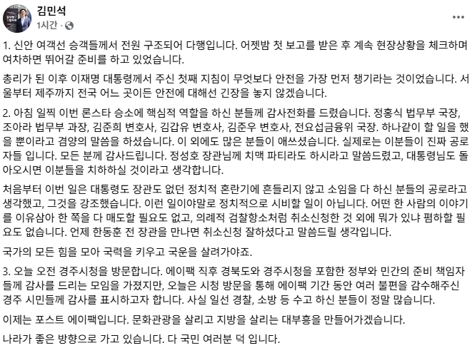 김 총리는 "정홍식 법무부 국장, 조아라 법무부 과장, 김준희 변호사, 김갑유 변호사, 김준우 변호사, 전요섭 금융위원회 국장"을 명시하며 "하나같이 할 일을 했을 뿐이라고 겸양의 말씀을 하셨다. 실제로는 이분들이 진짜 공로자들"이라고 적었습니다.